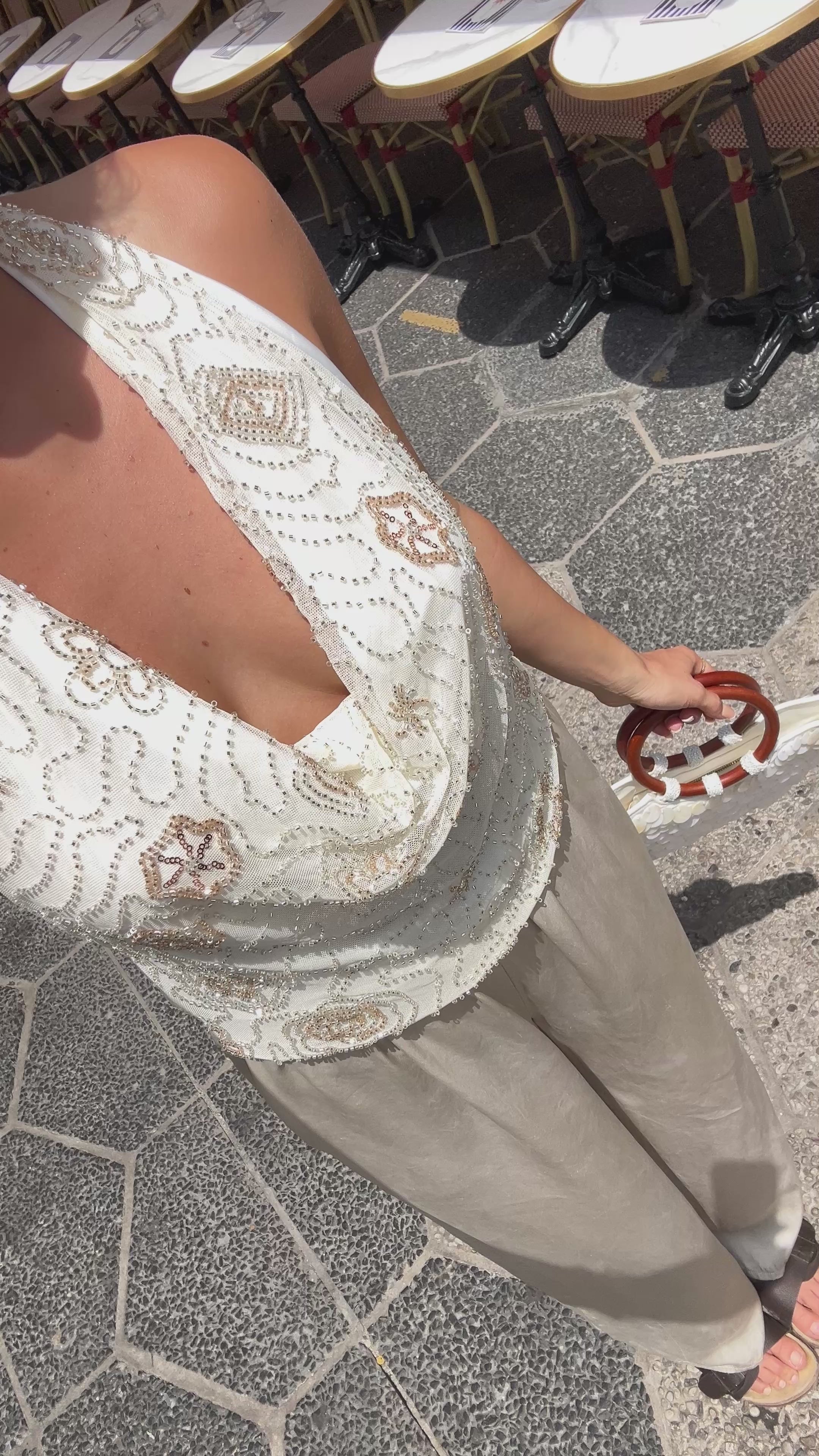 Embrace effortless elegance with the Estrid Sequin Embellished Cowl Neck Halter Top. Featuring a flattering front cowl that adds depth, this top showcases a daring open back for a touch of allure. The thick straps provide both comfort and support, making it perfect for your stylish evenings out.